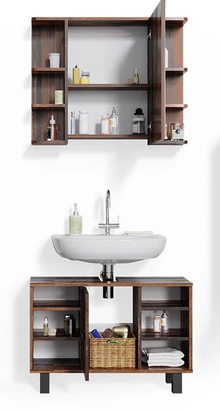 - Contenu de la livraison : • 1x armoire de toilette • 1x meuble sous-vasque Décoration non incluse