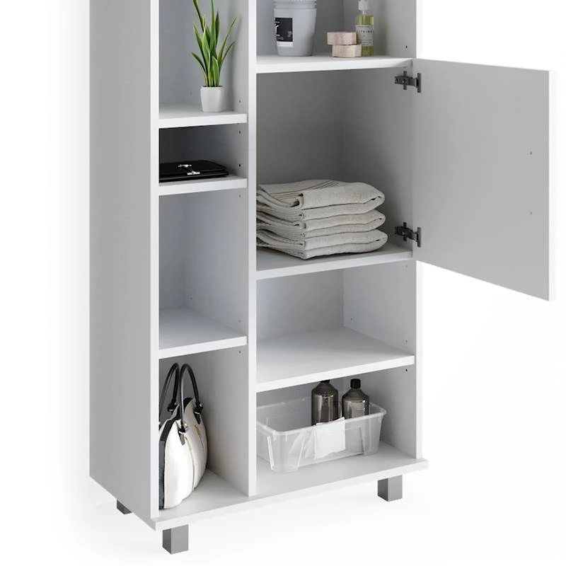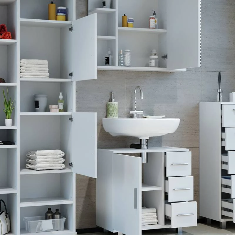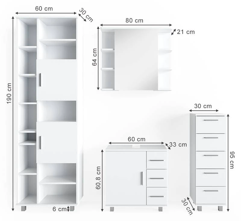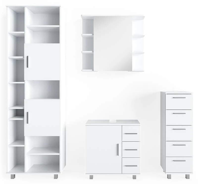 - Contenu de la livraison : • 1x armoire de toilette • 1x meuble sous-vasque • 1x chiffonnier • 1x meuble haut Décoration non incluse