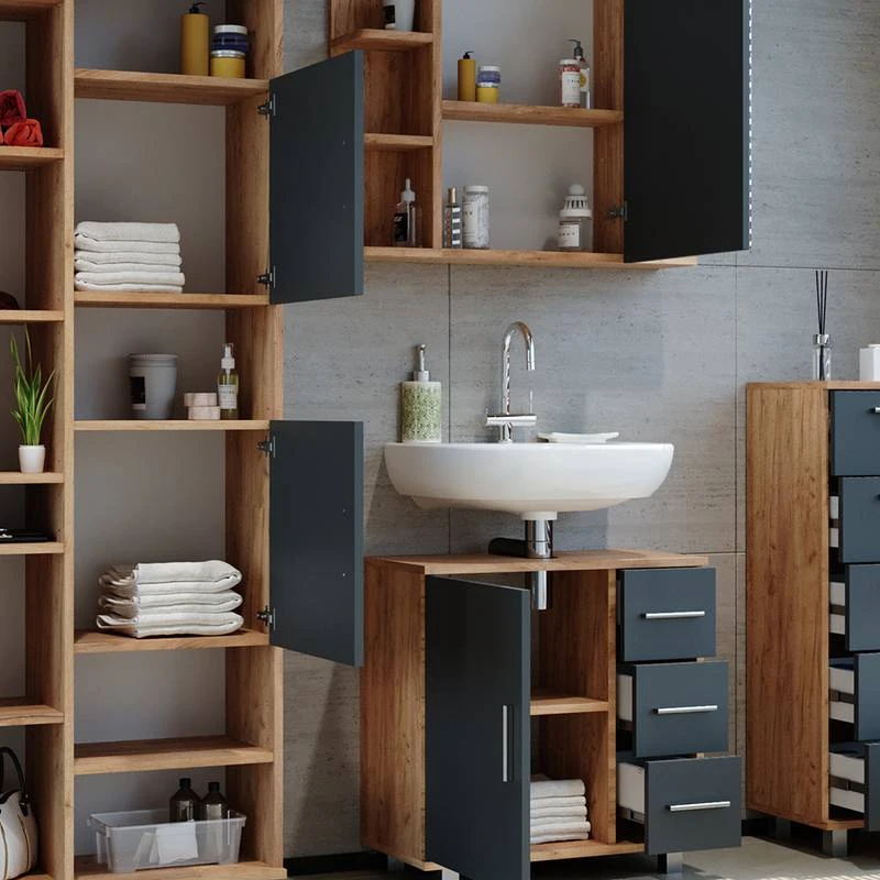- Contenu de la livraison : • 1x armoire de toilette• 1x meuble sous-vasque• 1x chiffonnier• 1x meuble hautDécoration non incluse