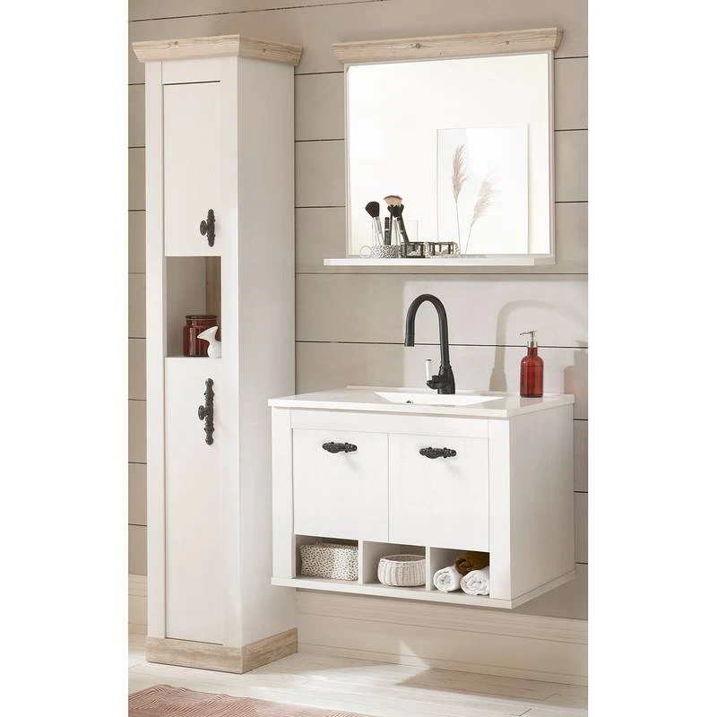 - Contenu de la livraison : Ensemble de salle de bain comprenant 1 meuble avec vasque en fonte minérale, 1 armoire colonne et 1 miroir