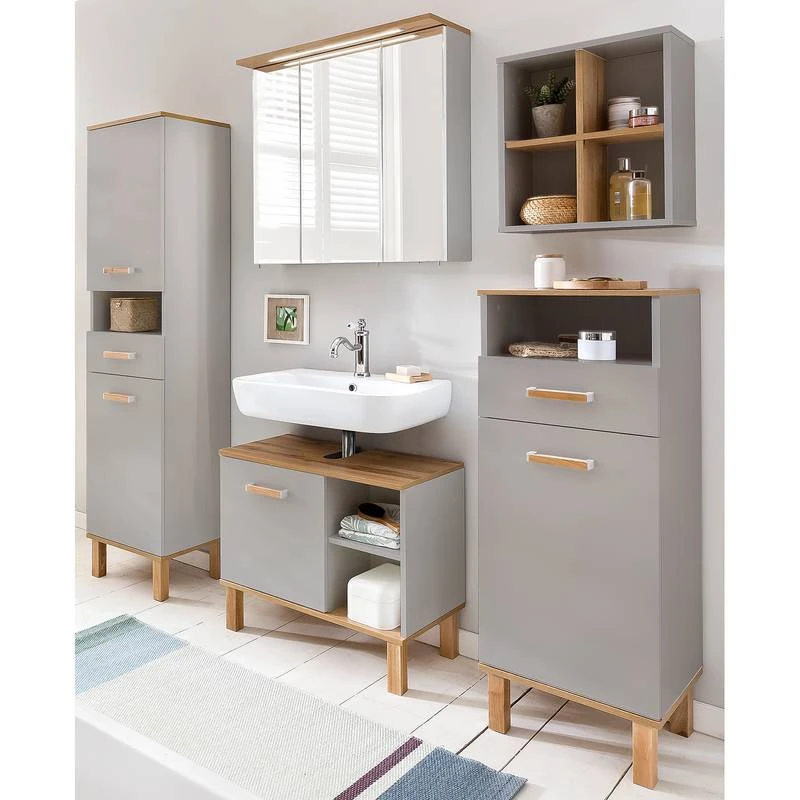 - Contenu de la livraison : Ensemble de salle de bain comprenant 1 meuble sous lavabo, 1 colonne de salle de bain, 1 armoire de salle de bain, 1 étagère et 1 armoire de toilette avec éclairage