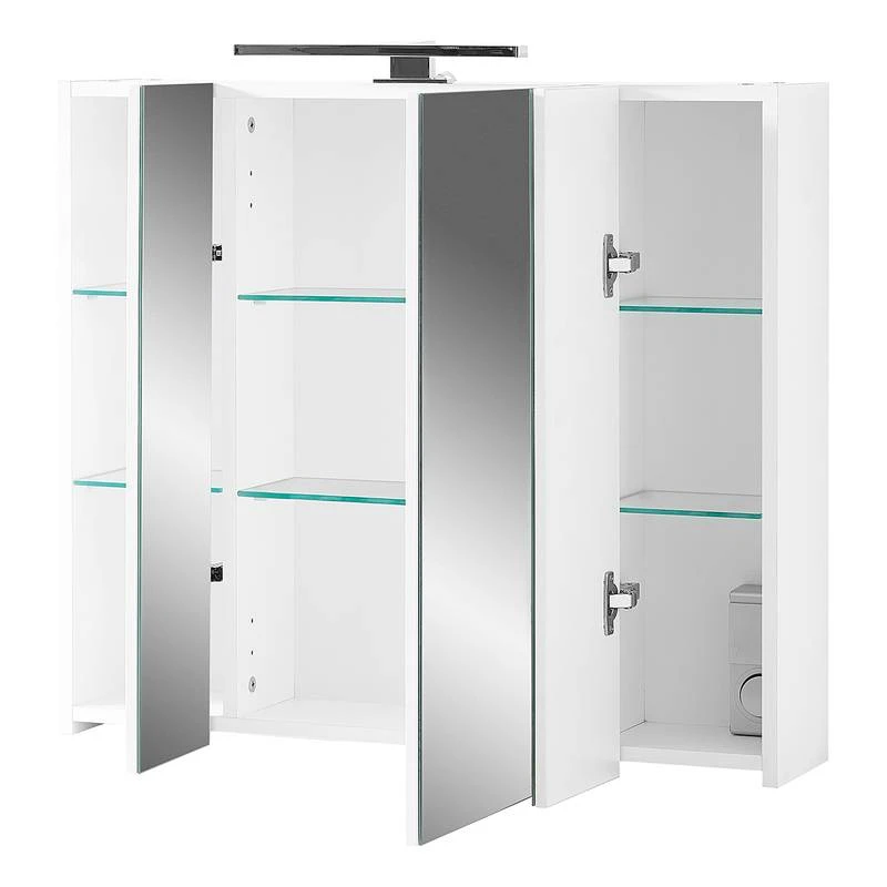 - Contenu de la livraison : Salle de bain comprenant 1 meuble sous lavabo, 1 armoire de toilette avec éclairage, 1 meuble bas, 1 armoire de salle de bain et 1 colonne de salle de bain, sans accessoires