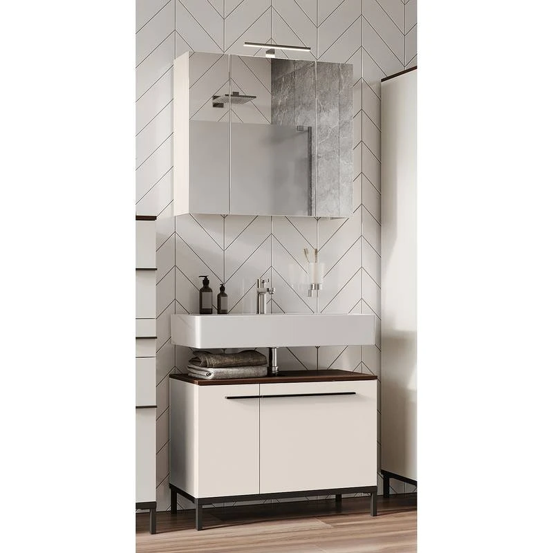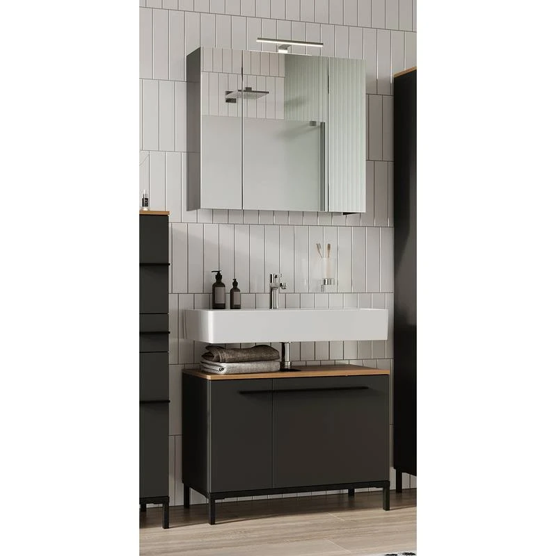 - Contenu de la livraison : Ensemble de salle de bain comprenant 1 meuble sous lavabo et 1 armoire de toilette avec éclairage, interrupteur et prise
