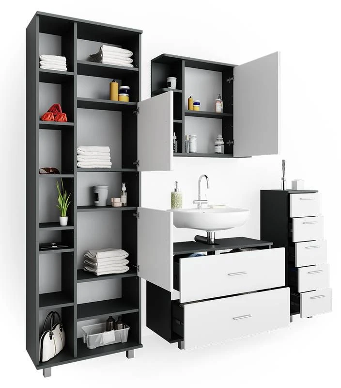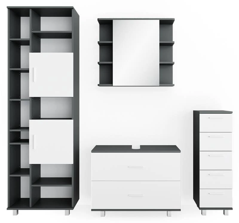- Contenu de la livraison : • 1x armoire de toilette• 1x meuble sous-vasque• 1x chiffonnier• 1x placardDécoration non incluse